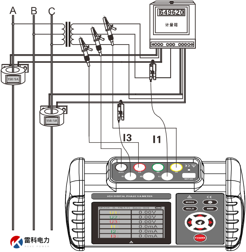 Reke2020三相交流電壓表電流、電壓間相位、電流間相位、電壓電流間相位、頻率、有功功率、無功功率、視在功率、功率因數(shù)、三相電流矢量和,判別相序、感性、容性電路等。測試接線如下: